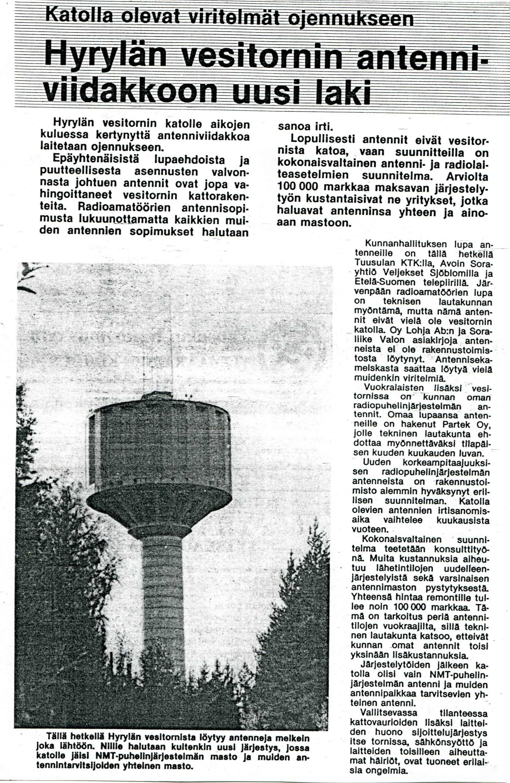 Tuusulalainen lehti 1990 Tuusulan vesitornissa olevien antennien (mm. OH2RUP) uudelleen järjestämisestä