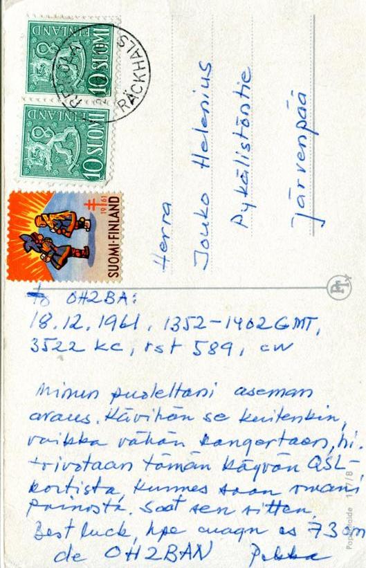 ”Elämässä on usein sattumia ja omituisuuksia. Tässä eräs, jossa punaisena lankana on kutsumerkki OH2BAN. Avaintekijänä on oheinen joulukortti vuodelta 1961. Sen mukaan pidin CW-yhteyden Pekan, OH2BAN:n kanssa joulun alla 1961. Itselläni oli tuolloin kutsuna OH2BA. Pekka asui Helsingin maalaiskunnan Rekolassa ja kyseinen QSO oli hänen ensimmäisensä.